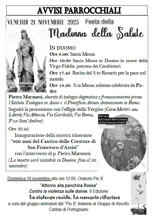 Venerdì 15 Novembre, è stata presentata la mostra itinerante il cui titolo è nella foto. Alle 18.00 uno degli autori Walter Azzaretti ha tracciato un breve escursus storico sulla presenza dell’ordine francescano a Portogruaro. Fra l’altro è stato messo in risalto il ruolo e il servizio del Cappuccini, che già nel 1500 sono stati presenti a Portogruaro.La presentazione si è conclusa con il Cantico delle Creature cantato dal Coro Noincanto diretto da Renzo Fantuzzo.